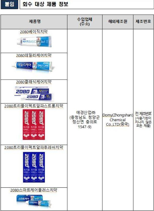 ½ÄǰÀǾàǰ¾ÈÀüó°¡ ±¹³»¿¡¼ Ä¡¾à¿¡ »ç¿ëÀÌ ±ÝÁöµÈ Æ®¸®Å¬·Î»ê ¼ººÐÀÌ ÇÔÀ¯µÈ °ÍÀ¸·Î ¾Ë·ÁÁø ¾Ö°æ»ê¾÷ÀÇ '2080' Ä¡¾à ¼öÀÔÁ¦Ç° 6Á¾ÀÇ Àü Á¦Á¶¹øÈ£ Á¦Ç° °Ë»ç¸¦ ½Ç½Ã ÁßÀÌÀ̶ó°í 16ÀÏ ¹àÇû´Ù. ÇØ´çÁ¦Ç°À» ¸¸µç ÇØ¿Ü Á¦Á¶¼Ò(Áß±¹ µµ¹Ì)¿¡ ´ëÇÑ ÇöÁö½Ç»çµµ ÁøÇàÇϰí ÀÖ´Ù.