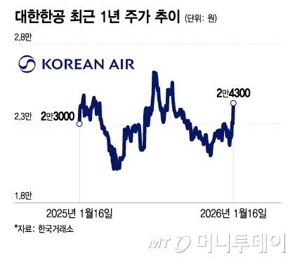 16ÀÏ Çѱ¹°Å·¡¼Ò¿¡ µû¸£¸é ´ëÇÑÇ×°øÀº ÀüÀÏ´ëºñ 1300¿ø(5.56%) ¿À¸¥ 2¸¸4300¿øÀ¸·Î ÀåÀ» ¸¶ÃÆ´Ù. ¿ÃÃÊ 2¸¸2000¿ø´ë¿¡ ¸Ó¹°·¶´ø ÁÖ°¡´Â ÃÖ±Ù ¿ì»óÇâÇØ 2¸¸5000¿ø¼±À» ¹Ù¶óº¸°í ÀÖ´Ù.