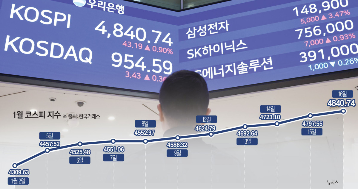 ÄÚ½ºÇǰ¡ ¿¬ÀÏ »ç»ó ÃÖ°íÄ¡¸¦ °¥¾ÆÄ¡¿ì¸ç 4800¼±¿¡ ¾ÈÂøÇß´Ù. ¡®²ÞÀÇ Áö¼ö¡¯·Î ºÒ¸®´Â ÄÚ½ºÇÇ 5000Æ÷ÀÎÆ®(¿ÀõÇÇ)±îÁö 160Æ÷ÀÎÆ®(3%) ³²¾Ò´Ù.