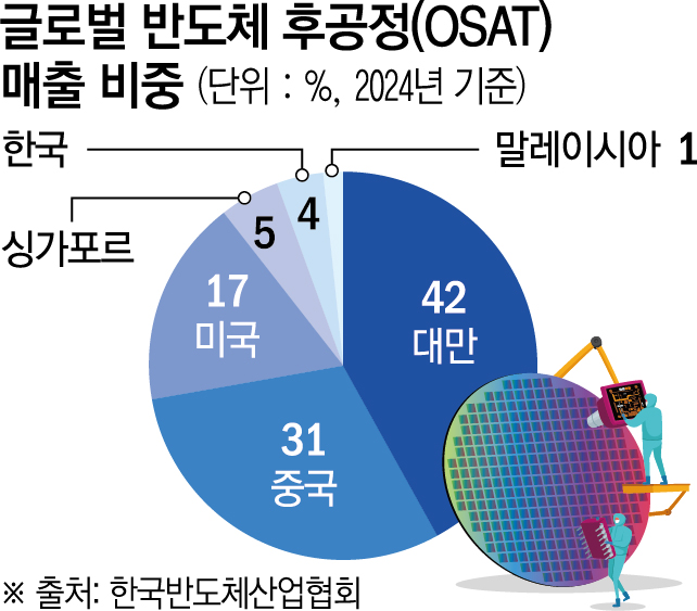 ÈİøÁ¤ ºÐ¾ß¿¡¼µµ ±¹³» ±â¾÷µéÀº °¥ ±æÀÌ ¸Ö´Ù. Çѱ¹¹ÝµµÃ¼»ê¾÷Çùȸ¿¡ µû¸£¸é 2024³â ±âÁØ ±Û·Î¹ú ¹ÝµµÃ¼ ÈİøÁ¤(OSAT) ±â¾÷ ¸ÅÃâ ºñÁßÀº ´ë¸¸ÀÌ 42%·Î °¡Àå ³ô°í, Áß±¹ 31%, ¹Ì±¹ 17%°¡ µÚ¸¦ Àմ´Ù. À̵é 3°³±¹ÀÌ Àüü ½ÃÀåÀÇ ¾à 90%¸¦ Â÷ÁöÇÏ´Â ±¸Á¶´Ù. Çѱ¹Àº ½Ì°¡Æ÷¸£¿¡ À̾î 4% ¼öÁØÀ¸·Î, ¾ÆÁ÷ Á¸Àç°¨ÀÌ Å©Áö ¾Ê´Ù. ±¹³» ÆÕ ÅõÀÚ°¡ È®´ëµÇ°í ÀÖÀ½¿¡µµ ÈİøÁ¤°ú Àåºñ ºÐ¾ß¿¡¼ ±¹»ê ºñÁßÀÌ Á¦ÇÑÀûÀÎ ÀÌÀ¯´Ù.