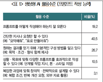 »ý¼ºÇü AIÀÇ È°¿ë ¿ª·®À» °¡´ÆÇÏ´Â ÁöÇ¥·Î ÇÁ·ÒÇÁÆ®(»ç¿ëÀÚ Áö½Ã¹®) ÀÛ¼º ´É·ÂÀ» »ìÆìº» °á°ú »óȲ¡¤¸ñÇ¥¿¡ ¸ÂÃç ´É¼÷ÇÏ°Ô ÇÁ·ÒÇÁÆ®¸¦ ÀÛ¼ºÇÒ ¼ö ÀÖ´Â '»ý¼ºÇü AI °íµµ Ȱ¿ëÀÚ'´Â ÀüüÀÇ 13.6%¿¡ ºÒ°úÇß´Ù. »ý¼ºÇü AI Ȱ¿ë°ú ¾÷¹« »ý»ê¼º °£ °ü°è¿¡ ´ëÇÑ È¸±ÍºÐ¼® °á°ú ÇÁ·ÒÇÁÆ® ÀÛ¼º ´É·ÂÀÌ ³ô¾ÆÁú¼ö·Ï Åë°èÀûÀ¸·Î À¯ÀÇÇÑ »ý»ê¼º °³¼± È¿°ú°¡ È®ÀεƴÙ.