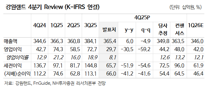 °¿ø·£µå´Â ÇöÀç ¿µ¾÷Àå ¼ö¿ë´É·Â(Capa) È®´ë¿Í ¸®Á¶Æ®¡¤Ä«Áö³ë ȯ°æ °³¼±À» À§ÇÑ º»°ÝÀûÀÎ ÅõÀÚ ´Ü°è¿¡ ÁøÀÔÇß´Ù. ÀÌ °úÁ¤¿¡¼ 2026~2027³â¿¡´Â ÀϽÃÀûÀÎ ½ÇÀû ¿ª¼ºÀåÀÌ ºÒ°¡ÇÇÇÒ °ÍÀ¸·Î Àü¸ÁµÈ´Ù. ´Ù¸¸ ½Å±Ô ¿µ¾÷Àå °³Àå°ú ÇÔ²² Ä«Áö³ë Å×ÀÌºí ¼ö°¡ ¾à 25% ´Ã¾î³ª°í, °´½Ç ·¹³ëº£ÀÌ¼Ç È¿°ú°¡ º»°ÝȵǴ 2028³âºÎÅÍ´Â À¯ÀǹÌÇÑ ½ÇÀû ¼ºÀå¼¼°¡ ³ªÅ¸³¯ °ÍÀ¸·Î NHÅõÀÚÁõ±ÇÀº ³»´ÙºÃ´Ù. ½Ã°¡¹è´ç·üÀº ÃÖ¼Ò 4.6% ¼öÁØÀÌ ¿¹»óµÈ´Ù.