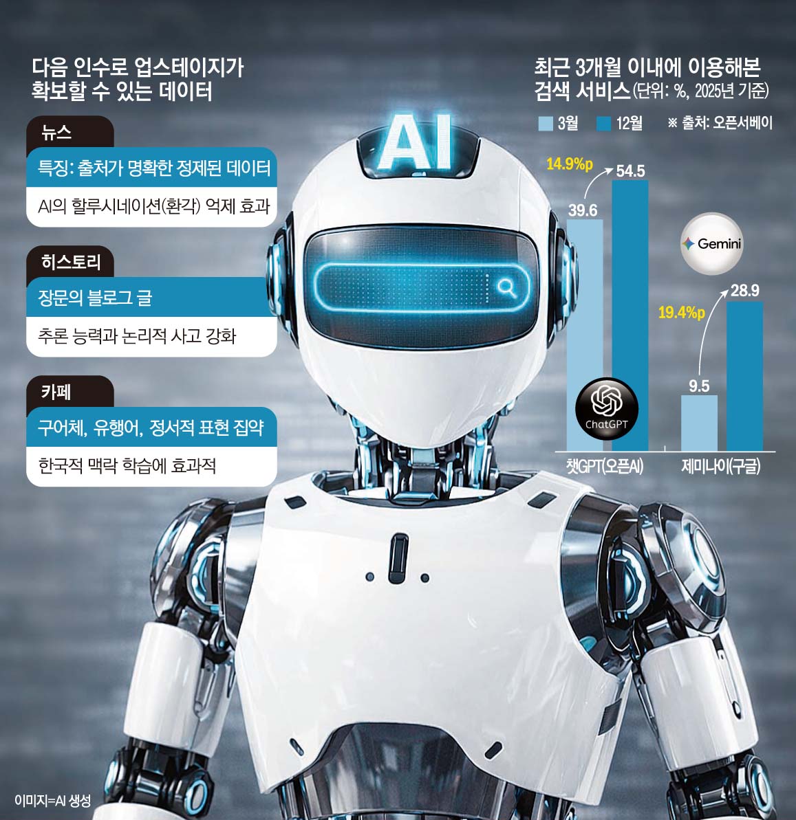 »ç¿ëÀÚÀÇ °Ë»ö È帧 ¶ÇÇÑ ±âÁ¸ÀÇ °Ë»ö ¿£ÁøÀ» ¹þ¾î³ª ´ëÈÇü AI·Î ºü¸£°Ô À̵¿Çϰí ÀÖ´Ù. ÃÖ±Ù ¿ÀǼº£ÀÌÀÇ Á¶»ç °á°ú¿¡ µû¸£¸é ÀüÅëÀûÀÎ °Ë»ö ¿£ÁøÀÇ ÀÌ¿ë·üÀº ³·¾ÆÁö´Â ¹Ý¸é AI ¼ºñ½º ÀÌ¿ë·üÀº ±ÞÁõÇß´Ù. ÃÖ±Ù 3°³¿ù ³» êGPTÀÇ ÀÌ¿ë·üÀº 39.6%¿¡¼ 54.5%·Î 14.9%Æ÷ÀÎÆ®(p) ¿Ã¶ú´Ù. Á¦¹Ì³ªÀ̵µ 9.5%¿¡¼ 28.9%·Î 19.4%p »ó½ÂÇß´Ù. ½ÃÀåÁ¶»ç¾÷ü °¡Æ®³Ê´Â ¿ÃÇØ ÀüÅëÀû °Ë»ö ¿£Áø º¼·ýÀÌ 25% °¨¼ÒÇÒ °ÍÀ̶ó°í Àü¸ÁÇß´Ù.