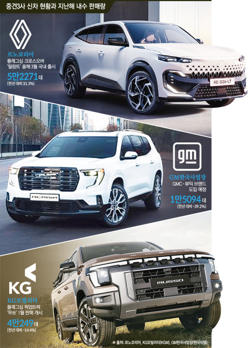 ±¹³» ¿Ï¼ºÂ÷ Áß°ß 3»ç ¸£³ëÄÚ¸®¾Æ, KG¸ðºô¸®Æ¼(KGM), GMÇѱ¹»ç¾÷Àå(Çѱ¹Áö¿¥)ÀÌ ¿ÃÇØ ºê·£µå¸¸ÀÇ Á¤Ã¼¼ºÀÌ ´ã±ä ¡®¶Ê¶ÊÇÑ ½ÅÂ÷¡¯·Î ÆÇ¸Å·® ¹Ýµî¿¡ ³ª¼±´Ù. Çö´ëÀÚµ¿Â÷¿Í ±â¾Æ¿Í ¼öÀÔÂ÷ °ø¼¼ ¼Ó¿¡¼µµ ½ÅÂ÷ È¿°ú·Î ±¹³» ½ÃÀå Á¡À¯À²À» ³ôÀ̰ڴٴ Àü·«ÀÌ´Ù.