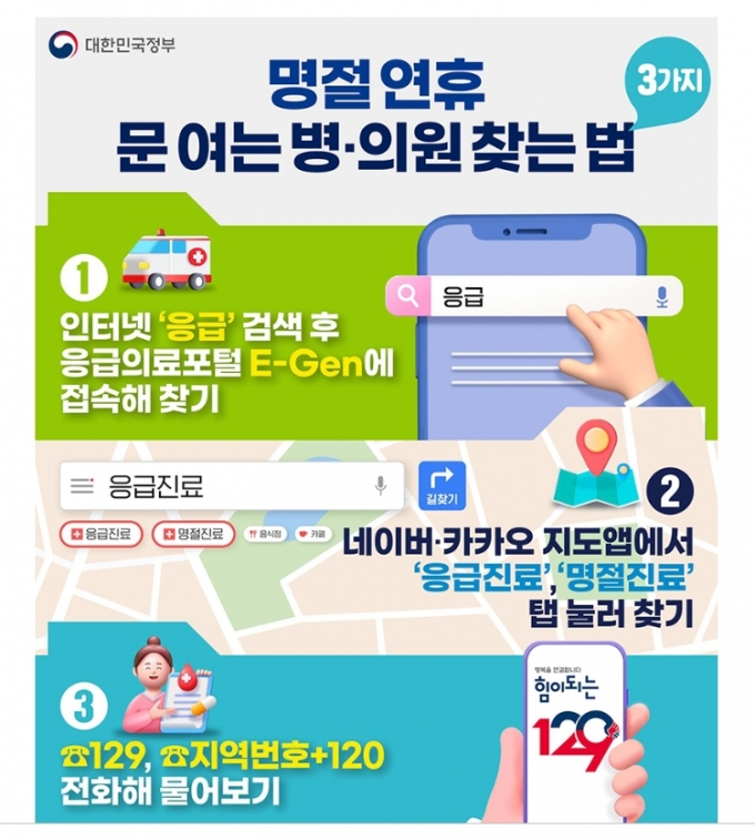¼³ ¿¬ÈÞ ¹® ¿©´Â ÀÇ·á±â°ü°ú ¾à±¹ Á¤º¸´Â º¸°Çº¹ÁöÄݼ¾ÅÍ 129, ½Ãµµ Äݼ¾ÅÍ 120, ÀÀ±ÞÀÇ·áÆ÷ÅÐ(e-gen)°ú ÆòÅá¤¼Ûźº¸°Ç¼Ò ´©¸®Áý¿¡¼ È®ÀÎÇÒ ¼ö ÀÖ´Ù.