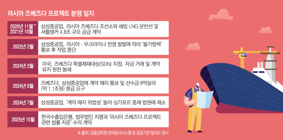 ºÐÀïÀÇ ¹ß´ÜÀÎ ÁÁî´Ù ÇÁ·ÎÁ§Æ®´Â »ï¼ºÁß°ø¾÷ÀÌ 2020³âºÎÅÍ 2021³â±îÁö ·¯½Ã¾Æ ÁÁî´Ù Á¶¼±¼Ò·ÎºÎÅÍ ¼öÁÖÇÑ ¾à 4Á¶8000¾ï ¿ø ±Ô¸ðÀÇ ¼±¹Ú °ÇÁ¶ »ç¾÷ÀÌ´Ù. 2022³â 2¿ù ÀüÀï ¹ß¹ß Á÷ÈÄ »ï¼ºÁß°ø¾÷Àº Á¤»óÀûÀÎ °øÁ¤ ÁøÇàÀÌ ºÒ°¡´ÉÇÑ 'ºÒ°¡Ç×·Â(Force Majeure)' »óȲÀÓÀ» ¼±Áֻ翡 ¾Ë¸®°í ÀÛ¾÷À» Áß´ÜÇß´Ù. ÀÌÈÄ 2024³â 2¿ù ¹Ì±¹ Á¤ºÎ°¡ ÁÁî´Ù¸¦ Ưº°Á¦Àç´ë»ó(SDN)À¸·Î ÁöÁ¤Çϸç ÀÚ±Ý °Å·¡°¡ ¿øÃµ ºÀ¼âµÆ´Ù. ÀÌ¿¡ ÁÁî´Ù ÃøÀº »ï¼ºÁß°ø¾÷¿¡ 2024³â 6¿ù °è¾à ÇØÁö¸¦ Å뺸ÇÏ¸ç ¼±¼ö±Ý ¾à 8¾ï´Þ·¯(1.1Á¶¿ø)ÀÇ ¹ÝȯÀ» ¿ä±¸Çß´Ù. ÀÌ¿¡ »ï¼ºÁß°ø¾÷ÀÌ Áï°¢ ½Ì°¡Æ÷¸£ ±¹Á¦ÁßÀç¼¾ÅÍ(SIAC)¿¡ ¼Ò¼ÛÀ» ³»¸ç ´ëÀÀ¿¡ ³ª¼± °¡¿îµ¥ ¼±¼ö±Ý ȯ±Þº¸Áõ(RG)À» ÀμöÇÑ ¼öÀºÀÇ º¸Áõ Ã¥ÀÓ ¹üÀ§°¡ À̹ø ºÐÀïÀÇ ÇÙ½É ÀïÁ¡À¸·Î ¶°¿Ã¶ú´Ù.