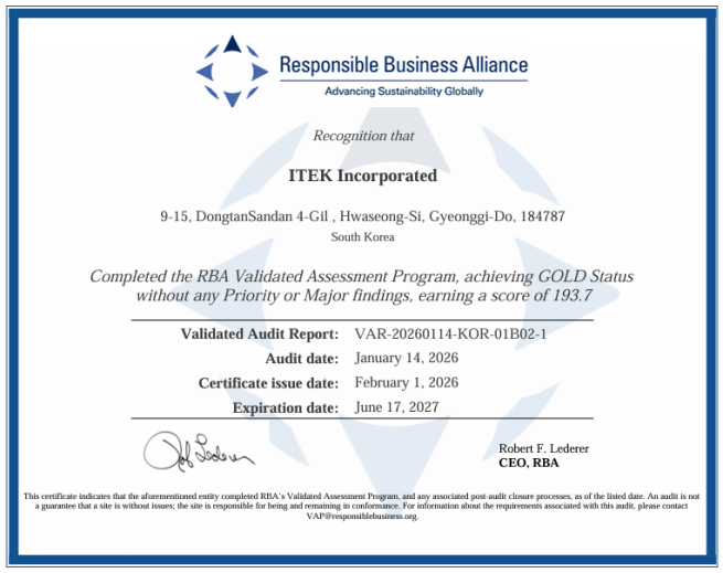 ½Ã½ºÅÛ ¹ÝµµÃ¼ Å×½ºÆ® Àü¹®±â¾÷ ¾ÆÀÌÅØÀÌ ±Û·Î¹ú °ø±Þ¸ÁÀÇ ÇÙ½É Ã´µµÀÎ RBA(Responsible Business Alliance, ½Å·ÚÇÒ ¼ö ÀÖ´Â ºñÁî´Ï½º ¿¬ÇÕ)ÀÇ VAP(Validated Assessment Program) ½É»ç¿¡¼ ÃÖ°í ¼öÁØÀÎ ¡®°ñµå(Gold)¡¯ µî±ÞÀ» ȹµæÇß´Ù°í 4ÀÏ ¹àÇû´Ù.