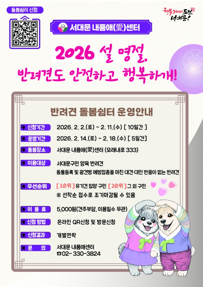ÀÌ¿ë·á´Â ÀÌ¿ë Àϼö¿Í °ü°è¾øÀÌ 5000¿øÀÌ´Ù. Èñ¸ÁÀÚ´Â ÀÌ´Þ 11ÀϱîÁö ¼´ë¹® ³»Ç°¾Ö¼¾ÅÍ È¨ÆäÀÌÁö¸¦ Âü°íÇØ QRÄÚµå·Î Á¢¼ÓÇϰųª ¼¾ÅÍ·Î ¹æ¹®ÇØ ½ÅûÇÏ¸é µÈ´Ù. À¯±â°ß ÀÔ¾ç ±¸¹ÎÀ» ¿ì¼± ¼±Á¤ÇÏ¸ç °á°ú´Â °³º° ¿¬¶ôÀ» ÅëÇØ ¾È³»ÇÑ´Ù. À̼ºÇå ¼´ë¹®±¸Ã»ÀåÀº "¼³ ¿¬ÈÞ ¹Ý·Áµ¿¹°À» ¾È½ÉÇÏ°í ¸Ã±â´Â µ¥ ¼´ë¹® ³»Ç°¾Ö¼¾ÅÍÀÇ µ¹º½ ¼ºñ½º°¡ µµ¿òÀÌ µÇ±æ ¹Ù¶õ´Ù"¸ç "¾ÕÀ¸·Îµµ ¹Ý·Áµ¿¹°°ú »ç¶÷ÀÌ ÇÔ²² ÇູÇÑ ¹Ý·Áµ¿¹° ģȵµ½Ã ¼´ë¹®±¸¸¦ ¸¸µé¾î °¡°Ú´Ù"°í ¸»Çß´Ù.
