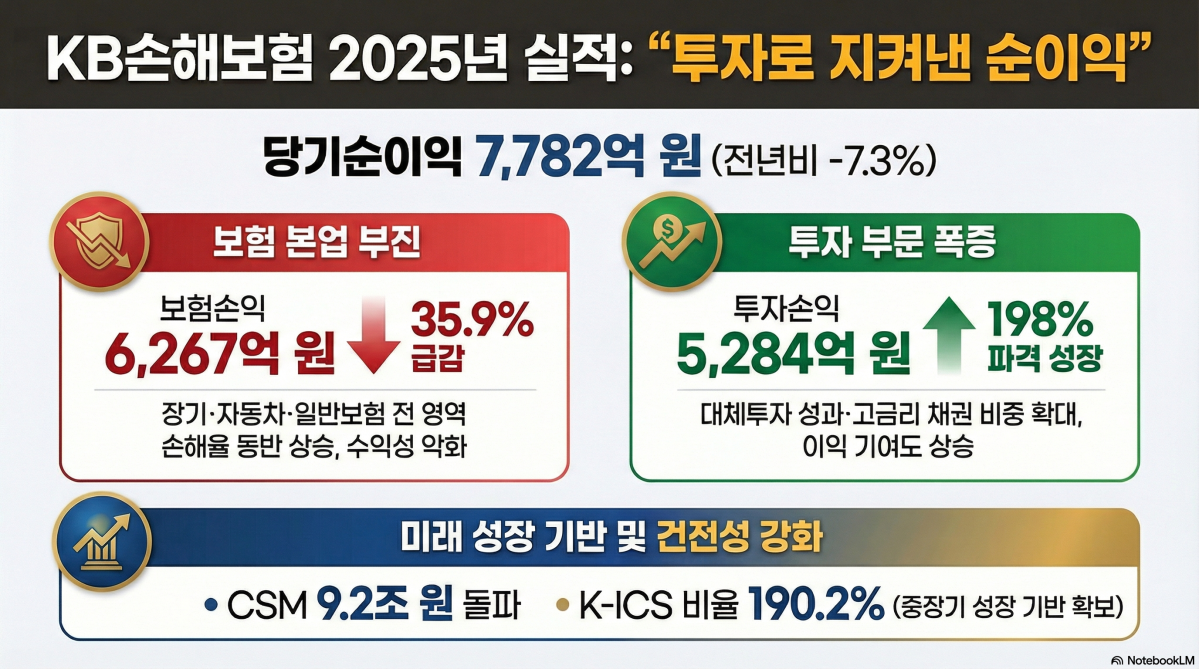 KB¼ÕÇØº¸Çè °ü°èÀÚ´Â ¡°2025³â¿¡´Â Àå±â¡¤ÀÚµ¿Â÷¡¤ÀϹݺ¸Çè Àü º¸Á¾ ¼ÕÇØÀ² »ó½Â ¿µÇâÀ¸·Î º¸Çè¼ÕÀÍÀÌ Àü³â ´ëºñ Å©°Ô °¨¼ÒÇßÁö¸¸, ´ëüÅõÀÚ È®´ë¿¡ µû¶ó ÅõÀÚ¼ÕÀÍÀÌ Å« ÆøÀ¸·Î Áõ°¡ÇØ ´ç±â¼øÀÌÀÍ °¨¼Ò´Â Á¦ÇÑÀûÀ̾ú´Ù¡±°í ¸»Çß´Ù.