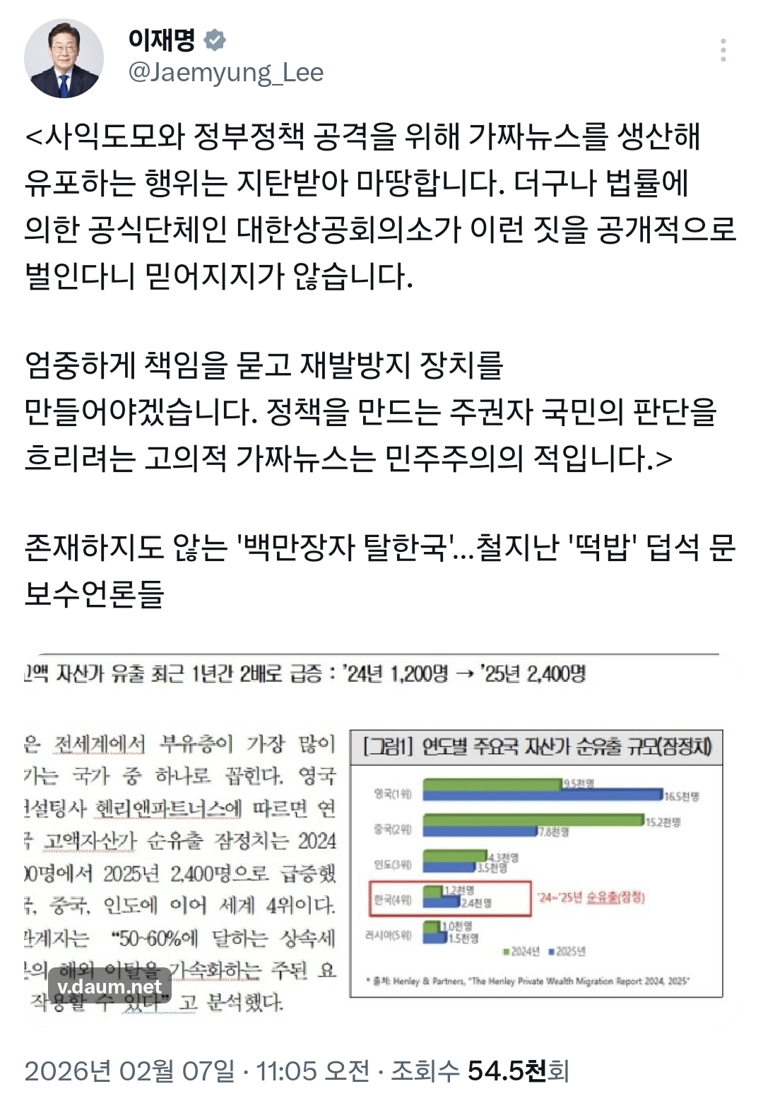 ¾Õ¼ ÀÌ ´ëÅë·ÉÀº À̳¯ ÀÚ½ÅÀÇ X(¿¾ Æ®À§ÅÍ)¿¡ 'Á¸ÀçÇÏÁöµµ ¾Ê´Â ¹é¸¸ÀåÀÚ Å»Çѱ¹¡¦Ã¶ Áö³ ¶±¹ä ´þ¼® ¹® º¸¼ö¾ð·Ðµé'À̶ó´Â Á¦¸ñÀÇ ±â»ç¸¦ °øÀ¯Çϸç "»çÀÍ µµ¸ð¿Í Á¤ºÎ Á¤Ã¥ °ø°ÝÀ» À§ÇØ °¡Â¥´º½º¸¦ »ý»êÇØ À¯Æ÷ÇÏ´Â ÇàÀ§´Â Áöź¹Þ¾Æ ¸¶¶¥ÇÏ´Ù"¸ç "´õ±¸³ª ¹ý·ü¿¡ ÀÇÇÑ °ø½Ä ´ÜüÀÎ ´ëÇÑ»ó°øÈ¸ÀǼҰ¡ ÀÌ·± ÁþÀ» °ø°³ÀûÀ¸·Î ¹úÀÎ´Ù´Ï ¹Ï¾îÁöÁö°¡ ¾Ê´Â´Ù"°í ºñÆÇÇß´Ù. ±×·¯¸é¼ "¾öÁßÇÏ°Ô Ã¥ÀÓÀ» ¹¯°í Àç¹ß ¹æÁö ÀåÄ¡¸¦ ¸¸µé¾î¾ß°Ú´Ù"¸ç "Á¤Ã¥À» ¸¸µå´Â ÁÖ±ÇÀÚ ±¹¹ÎÀÇ ÆÇ´ÜÀ» È帮·Á´Â °íÀÇÀû °¡Â¥´º½º´Â ¹ÎÁÖÁÖÀÇÀÇ ÀûÀÌ´Ù"¶ó°í Çß´Ù.