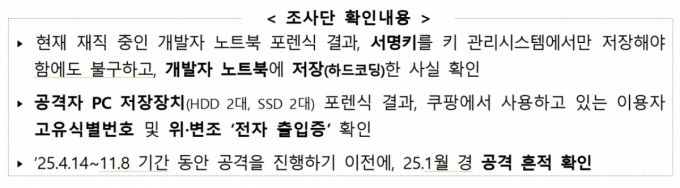 ÄíÆÎÀº Ä§ÇØ»ç°í ¿øÀÎ ºÐ¼®À» À§ÇØ ÀڷẸÀüÀ» Ç϶ó´Â °ú±âÁ¤ÅëºÎÀÇ ¸í·Éµµ µèÁö ¾Ê¾Ò´Ù. °ú±âÁ¤ÅëºÎ´Â Á¤º¸Åë½Å¸Á¹ý Á¦48Á¶ÀÇ4¿¡ µû¶ó ÄíÆÎ¿¡ ÀڷẸÀüÀ» ¸í·É('25.11.19 22:34)ÇßÁö¸¸, ÄíÆÎÀº ÀÚ»ç Á¢¼Ó±â·ÏÀÇ ÀÚµ¿ ·Î±× ÀúÀå Á¤Ã¥À» Á¶Á¤ÇÏÁö ¾Ê¾Æ ¾à 5°³¿ù('24.7~11¿ù) ºÐ·® À¥ Á¢¼Ó±â·ÏÀÌ »èÁ¦µÆ´Ù. ¶Ç ¾ÖÇø®ÄÉÀÌ¼Ç Á¢¼Ó±â·Ï(·Î±×)µµ Áö³ÇØ 5.23~6.2ÀÏ °£ÀÇ µ¥ÀÌÅͰ¡ »èÁ¦µÆ´Ù. ÀÌ´Â ¼ö»ç±â°ü¿¡ ¼ö»ç¸¦ ÀÇ·ÚÇß´Ù.