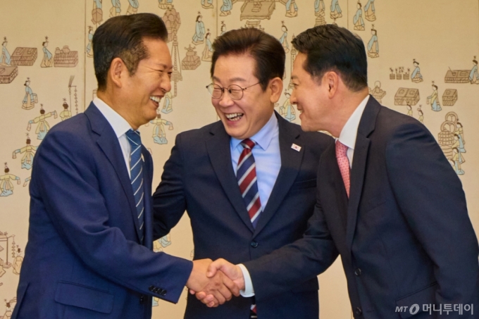 ÀÌÀç¸í ´ëÅë·ÉÀÌ 12ÀÏ ¿©¾ß ´ëÇ¥¿Í ¿ÀÂù ȸµ¿À» ÇÑ´Ù. ÀÌ ´ëÅë·É°ú Á¤Ã»·¡ ´õºÒ¾î¹ÎÁÖ´ç ´ëÇ¥, À嵿Çõ ±¹¹ÎÀÇÈû ´ëÇ¥ µî ¼¼ »ç¶÷ÀÌ ÇÑ ÀÚ¸®¿¡¼ ¸¸³ª´Â °ÍÀº ÀÌ ´ëÅë·ÉÀÌ Ã»¿Í´ë·Î Áý¹«½ÇÀ» ¿Å°Ü¿Â ÈÄ Ã³À½ÀÌÀÚ Áö³ÇØ 9¿ù ÀÌÈÄ 5°³¿ù ¿© ¸¸ÀÌ´Ù.