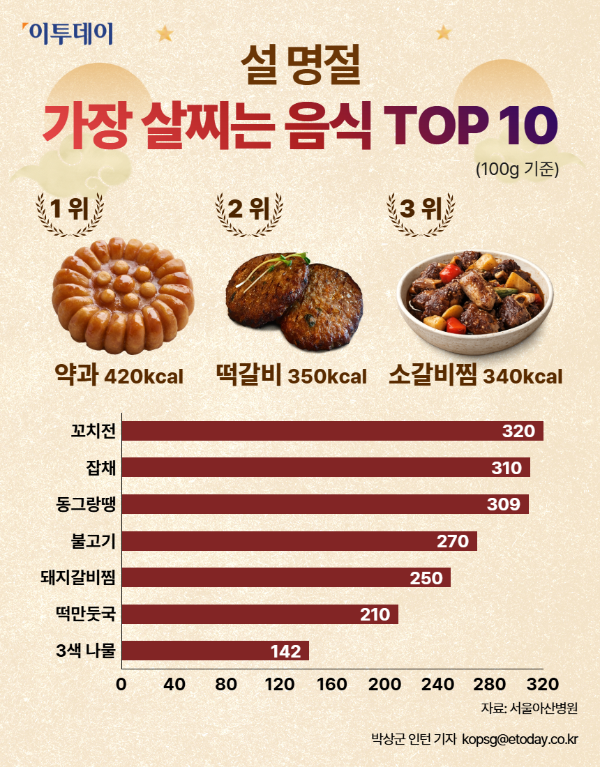 7À§´Â ºÒ°í±â(¾à 270§»), 8À§´Â µÅÁö°¥ºñÂò(¾à 250§»), 9À§´Â ¶±¸¸µÔ±¹(¾à 210§»)À̾ú°í, 10À§´Â °Ç°ÇÑ À½½ÄÀ¸·Î¸¸ º¸¿´´ø 3»ö ³ª¹°ÀÌ 100g´ç ¾à 142§»¸¦ ±â·ÏÇÏ¸é¼ À̸§À» ¿Ã·È´Ù.