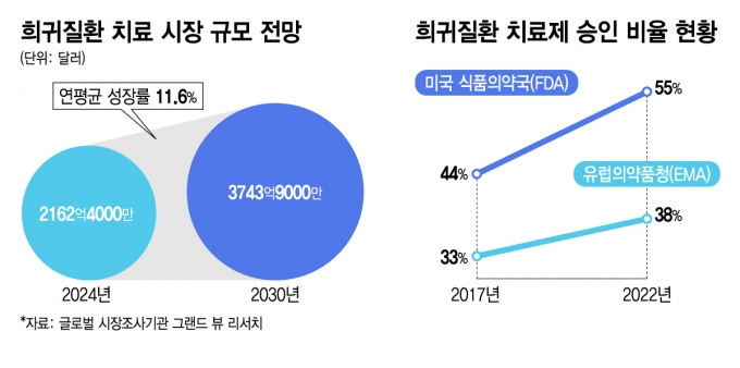Àü ¼¼°èÀûÀ¸·Îµµ Èñ±ÍÁúȯ Ä¡·áÁ¦´Â Á¦µµÀû Áö¿ø¿¡ ÈûÀÔ¾î ´Ù¸¥ Áúȯ±ºº¸´Ù Ȱ¹ßÇÑ Ä¡·áÁ¦ °³¹ßÀÌ ÀÌ·ïÁö°í ÀÖ´Ù. ±Û·Î¹ú ½ÃÀåÁ¶»ç±â°ü ±×·£µåºä¸®¼Ä¡¿¡ µû¸£¸é ±Û·Î¹ú Èñ±ÍÁúȯ Ä¡·á ½ÃÀå ±Ô¸ð´Â 2024³â 2162¾ï4000¸¸´Þ·¯¿¡¼ 2030³â 3743¾ï9000¸¸´Þ·¯·Î ¿¬Æò±Õ ¾à 11.6% ¼ºÀåÇÒ °ÍÀ¸·Î Àü¸ÁµÈ´Ù.