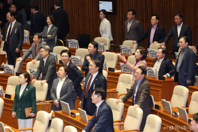 ÇÑÆí ±¹È¸¿¡¼± Áö³ÇØ 8¿ù¿¡µµ ±¹¹ÎÀÇÈûÀÌ ÃßõÇÑ ±¹°¡ÀαÇÀ§¿øÈ¸ À§¿ø ¼±Ãâ¾ÈÀÌ º»È¸ÀÇ¿¡¼ ºÎ°áµÇ¸é¼ ¿©¾ß °£ Ãæµ¹ÀÌ ºú¾îÁø ¹Ù ÀÖ´Ù. ´ç½Ã ±¹¹ÎÀÇÈû ÀÇ¿øµéÀº "µ¶Àç Ÿµµ"¸¦ ¿ÜÄ¡¸ç º»È¸ÀÇÀåÀ» ¶°³µ°í, ±¹È¸ ÀÏÁ¤¿¡ Àü¸é º¸ÀÌÄàÇß´Ù.