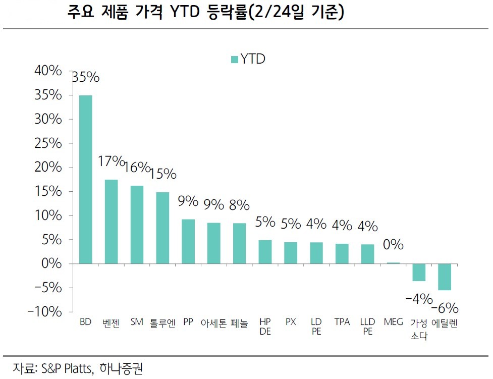 ½ÇÁ¦·Î ±âÃÊÀ¯ºÐÀÎ ÇÁ·ÎÇÊ·»°ú ºÎŸµð¿£ °¡°ÝÀº ÀÛ³â 12¿ù ´ëºñ °¢°¢ 5%, 46% »ó½ÂÇßÀ¸¸ç, õ¿¬°í¹« ¹× ½ºÅ¸ÀÌ·» ºÎŸµð¿£ °í¹«(SBR)¡¤ºÎŸµð¿£ °í¹«(BR) °¡°Ýµµ 15~23%°¡·® ¿Ã¶ú´Ù. ÀÌ ¼ö¼®¿¬±¸¿øÀº ¡°´Ü±â ÆÝ´õ¸àÅÐÀº ¿©ÀüÈ÷ ºÎÁøÇϳª ±¸Á¶Á¶Á¤ ±¹¸é¿¡¼ ³ªÅ¸³ª´Â °¡°Ý ¹Ýµî Ãß¼¼¸¦ °í·ÁÇÒ °æ¿ì Á¡ÁøÀûÀÎ ½ºÇÁ·¹µå °³¼±°ú ¼öÀͼº ȸº¹µµ °¡´ÉÇÒ Àü¸Á¡±À̶ó°í ³»´ÙºÃ´Ù.