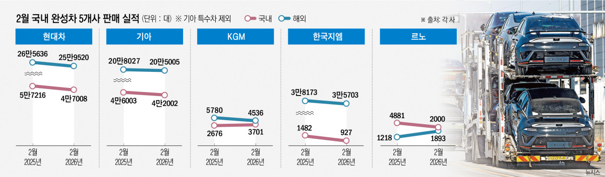 3ÀÏ Çö´ëÀÚµ¿Â÷¡¤±â¾Æ¡¤KG¸ðºô¸®Æ¼(KGM)¡¤GM Çѱ¹»ç¾÷Àå(Çѱ¹Áö¿¥)¡¤¸£³ëÄÚ¸®¾ÆÀÇ 2¿ù Á¾ÇÕ ÆÇ¸Å·®Àº ÃÑ 60¸¸2689´ë·Î Áý°èµÆ´Ù. ÀÌ´Â Àü³â µ¿¿ù ´ëºñ 4.56% °¨¼ÒÇÑ ¼öÄ¡´Ù. À̵é 5»ç´Â ±â¾Æ Ư¼öÂ÷¸¦ Á¦¿ÜÇϰí´Â ³»¼ö 9¸¸5638´ë, ÇØ¿Ü 50¸¸6657´ë¸¦ ÆÇ¸ÅÇß´Ù. ³»¼ö ÆÇ¸Å·®Àº Áö³ÇØ °°Àº ±â°£º¸´Ù 14.8% °¨¼ÒÇß°í ÇØ¿Üµµ 2.34% ÁÙ¾ú´Ù.