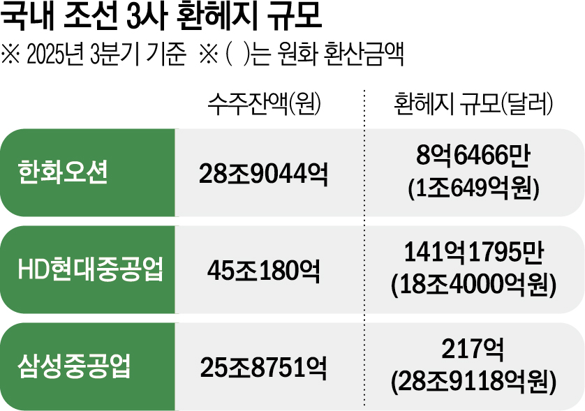 Á¶¼±»çº° ȯÇìÁö Àü·«¿¡ µû¶ó ½ÇÁ¦ ȯÀ² ¼öÇý Á¤µµ´Â ´Þ¶óÁú ¼ö ÀÖ´Ù. ȯÇìÁö ºñÀ²ÀÌ ³·À»¼ö·Ï ȯÀ² »ó½Â ½Ã ÀÌÀÍ È®´ë °¡´É¼ºÀÌ Ä¿Áö´Â ±¸Á¶´Ù. Áö³ÇØ 3ºÐ±â ±âÁØÀ¸·Î »ìÆìº¸¸é, »ï¼ºÁß°ø¾÷Àº ¼öÁÖ ´ë±ÝÀ» ´ëºÎºÐ ¼±¹°È¯ °è¾àÀ¸·Î ȯÇìÁöÇØ »ç½Ç»ó ȯÀ² º¯µ¿ ¿µÇâÀ» ÃÖ¼ÒÈÇÑ´Ù. HDÇö´ëÁß°ø¾÷Àº ¼öÁÖÀÜ°í ¾à 45Á¶180¾ï ¿ø °¡¿îµ¥ ¼±¹°È¯ ¸Åµµ ±Ô¸ð°¡ ¾à 141¾ï ´Þ·¯·Î ¾à 41% ¼öÁØÀÇ È¯ÇìÁö¸¦ ¿î¿µÇϰí ÀÖ´Ù. ¹Ý¸é ÇÑÈ¿À¼ÇÀº ¼öÁÖÀܰí 28Á¶9044¾ï ¿ø ´ëºñ ¼±¹°È¯ ¸Åµµ ±Ý¾×ÀÌ ¾à 8¾ï6466¸¸ ´Þ·¯·Î ȯÇìÁö ºñÀ²ÀÌ ¾à 3.7% ¼öÁØ¿¡ ±×ÃÆ´Ù.