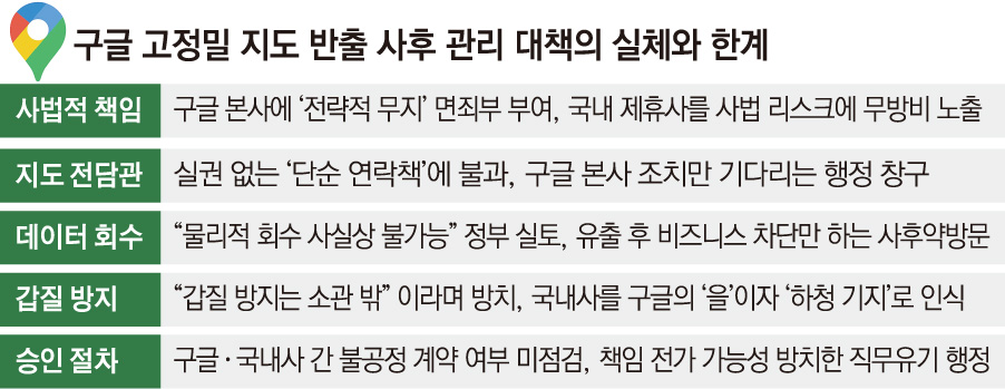 Á¤ºÎ°¡ ±¸±ÛÀÇ °íÁ¤¹Ð Áöµµ µ¥ÀÌÅÍ ¹ÝÃâ °úÁ¤¿¡¼ ³»¼¼¿î ´ëÃ¥ÀÌ »ç½Ç»ó ±¹³» ±â¾÷À» ±Û·Î¹ú ºòÅ×Å©ÀÇ »ç¹ýÀû ¸®½ºÅ©¸¦ ´ë½Å Áû¾îÁú ¡®Èñ»ý¾ç¡¯À¸·Î »ï¾Ò´Ù´Â ³í¶õÀÌ ºÒ°ÅÁ³´Ù. Á¤ºÎ´Â ±¸±Û º»»ç¿¡ »ç¹ýÀû Ã¥ÀÓÀ» ÇÇÇÒ ¡®¹«ÁöÀÇ ¸éÁ˺Ρ¯¸¦ Áã¿©ÁÖ´Â ´ë½Å, ½Ç¹«¸¦ ¸ÃÀº ±¹³» ±â¾÷À» ¡®¹æÆÐ¸·ÀÌ¡¯·Î Àü¶ô½ÃÄ×´Ù´Â °ÍÀÌ´Ù. Á¤ºÎ°¡ »çÈÄ °ü¸® ´ëÃ¥ÀÇ ÇÙ½ÉÀ¸·Î °Á¶Çؿ ¡®Áöµµ Àü´ã°ü¡¯ Á¦µµ ¿ª½Ã ½ÇÁúÀûÀÎ ÅëÁ¦±ÇÀ̳ª, ±¸¼Ó·ÂÀÌ ¾ø´Â ´Ü¼ø ¾÷¹« ¼öŹÀÚ ¼öÁØ¿¡ ±×Ä£´Ù´Â »ç½Ç ¶ÇÇÑ È®ÀεƴÙ.