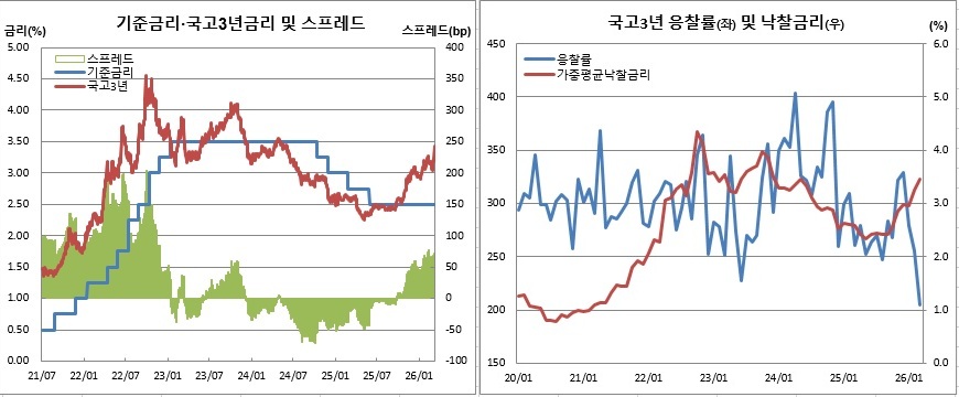 ¹Ì±¹-À̶õ ÀüÀïÀ¸·Î ±¹Á¦À¯°¡°¡ ¹è·²´ç 100´Þ·¯¸¦ µ¹ÆÄÇÏ¸é¼ ±¹³» ä±Ç½ÃÀåÀÌ Å©°Ô Èçµé¸®°í ÀÖ´Ù. Çѱ¹ÀºÇà ±ÝÀ¶ÅëÈÀ§¿øÈ¸ÀÇ ±âÁرݸ® ÀÎÇÏ ±â´ë°¡ ¾àÇØÁø »óȲ¿¡¼ ¹°°¡ ºÒ¾È±îÁö ´Ù½Ã °í°³¸¦ µéÀÚ ±¹°íä ±Ý¸®°¡ ÇÏ·ç ¸¸¿¡ 20bp(1bp=0.01%p) °¡±îÀÌ ±ÞµîÇß°í, ±× ¿©ÆÄ´Â ȸ»çä ½ÃÀåÀ¸·Î ºü¸£°Ô ¹øÁö´Â ºÐÀ§±â´Ù. »ó¹Ý±â ´ë±Ô¸ð ¸¸±â¸¦ ¾ÕµÐ ±â¾÷µé·Î¼± Â÷ȯ ºÎ´ãÀÌ ÇÑÃþ Ä¿Áú ¼ö¹Û¿¡ ¾ø´Ù´Â ¿ì·Á°¡ ³ª¿Â´Ù.
