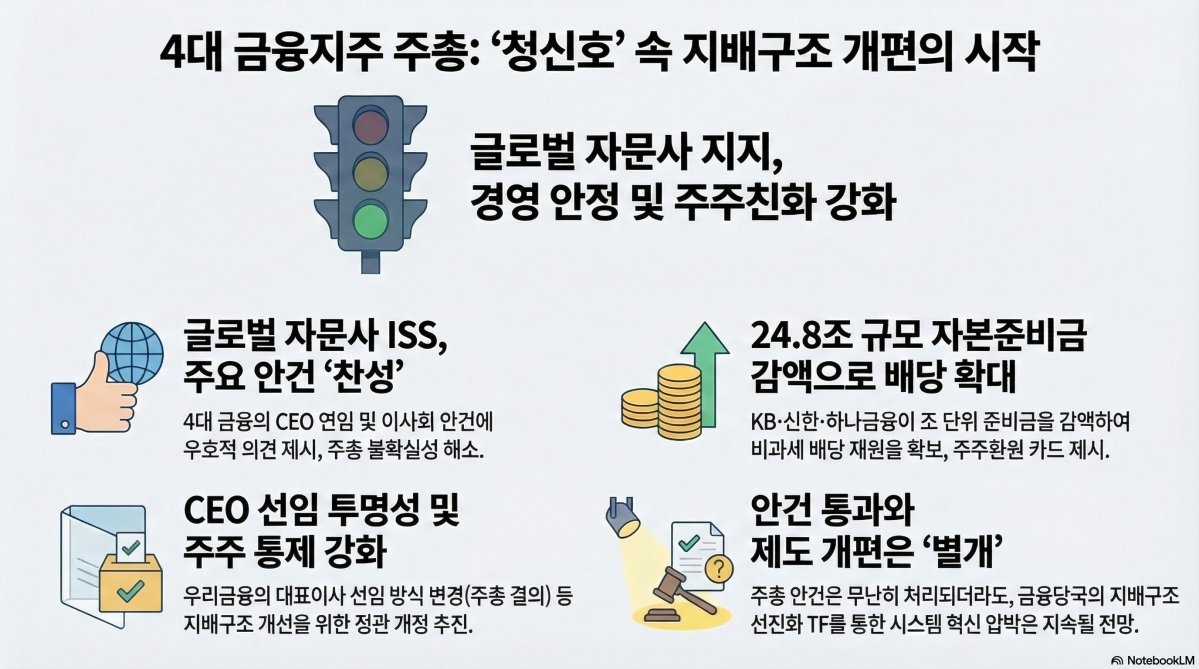 12ÀÏ ±ÝÀ¶±Ç¿¡ µû¸£¸é ±Û·Î¹ú Àǰá±Ç ÀÚ¹®»çÀÎ ISS´Â KB¡¤½ÅÇÑ¡¤Çϳª¡¤¿ì¸®±ÝÀ¶ÀÌ ÀÌ´Þ Á¤±â ÁÖÁÖÃÑȸ¿¡ ¿Ã¸° ÁÖ¿ä ¾È°Ç Àü¹Ý¿¡ ´ëü·Î Âù¼º ÀǰßÀ» ³Â´Ù. °ü½ÉÀ» ¸ð¾Ò´ø ÀÓÁ¾·æ ¿ì¸®±ÝÀ¶ ȸÀå°ú Áø¿Áµ¿ ½ÅÇѱÝÀ¶ ȸÀå ¿¬ÀӾȿ¡µµ ¿ìÈ£Àû ÆÇ´ÜÀÌ À̾îÁö¸é¼ ÁÖ¿ä ¾È°ÇÀº ¹«³È÷ ó¸®µÉ °¡´É¼ºÀÌ Ä¿Á³´Ù´Â Æò°¡´Ù.