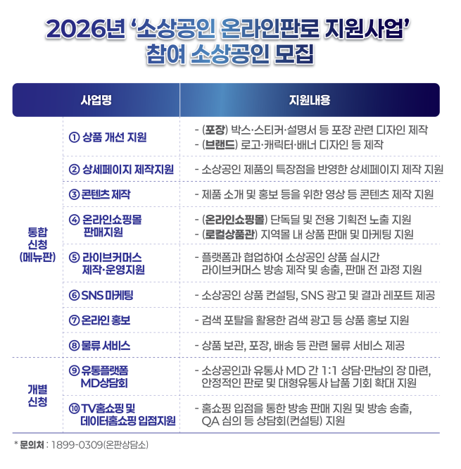 ƯÈ÷ ¿ÃÇØºÎÅÍ´Â ÇÊ¿äÇÑ Áö¿ø Ç׸ñÀ» ÇÑ ¹ø¿¡ ½ÅûÇÒ ¼ö ÀÖ´Â ¡®¸Þ´ºÆÇ½Ä¡¯ ÅëÇÕ ½Åû ¹æ½ÄÀ» µµÀÔÇß´Ù. ¼Ò»ó°øÀÎÀº ¡â»óǰ °³¼± ¡â»ó¼¼ÆäÀÌÁö Á¦ÀÛ ¡âÄÜÅÙÃ÷ Á¦ÀÛ ¡â¿Â¶óÀÎ ¼îÇθô ÀÔÁ¡ ¡â¶óÀ̺êÄ¿¸Ó½º Á¦ÀÛ¡¤¿î¿µ ¡â»çȸ°ü°è¸Á¼ºñ½º(SNS) ¸¶ÄÉÆÃ ¡â¿Â¶óÀÎ È«º¸ ¡â¹°·ù ¼ºñ½º µî 8°³ ¼¼ºÎ »ç¾÷ °¡¿îµ¥ ÃÖ´ë 4°³ »ç¾÷À» µ¿½Ã¿¡ ½ÅûÇÒ ¼ö ÀÖ´Ù.