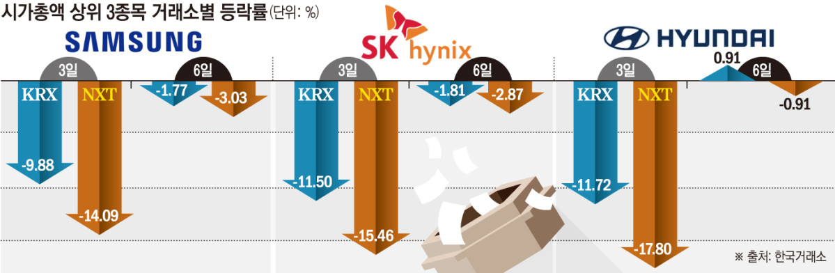 ¹Ì±¹°ú À̶õÀÇ ÀüÀïÀÌ Ã³À½À¸·Î ±¹³» Áõ½Ã¸¦ Ÿ°ÝÇÑ ÀÌ´Þ 3ÀÏ Àå¼¼´Â À̸¦ ´ÜÀûÀ¸·Î º¸¿©ÁØ´Ù. ÁÖ¿ä ½Ã°¡ÃÑ¾× »óÀ§Á¾¸ñÀº °Å·¡¼Ò Á¤±ÔÀå ¸¶°¨ ÈÄ NXT¿¡¼ ´õ Å« ÆøÀ¸·Î ³»·Á¾É¾Ò´Ù. »ï¼ºÀüÀÚ´Â 3ÀÏ KRX Á¾°¡°¡ 19¸¸5100¿øÀ̾úÁö¸¸ NXT Á¾°¡´Â 18¸¸6000¿øÀ¸·Î ³»·Á¾É¾Ò´Ù. Á¤±ÔÀå ±âÁØ Ç϶ô·üÀº 9.88%¿´Áö¸¸ NXT ±âÁØ ³«ÆøÀº 14.09%·Î ´õ Ä¿Á³´Ù. SKÇÏÀ̴нºµµ KRX Á¾°¡´Â 93¸¸9000¿øÀ¸·Î 11.50% ³»·ÈÀ¸³ª NXT Á¾°¡´Â 89¸¸7000¿øÀ¸·Î 15.46% ±Þ¶ôÇß´Ù.