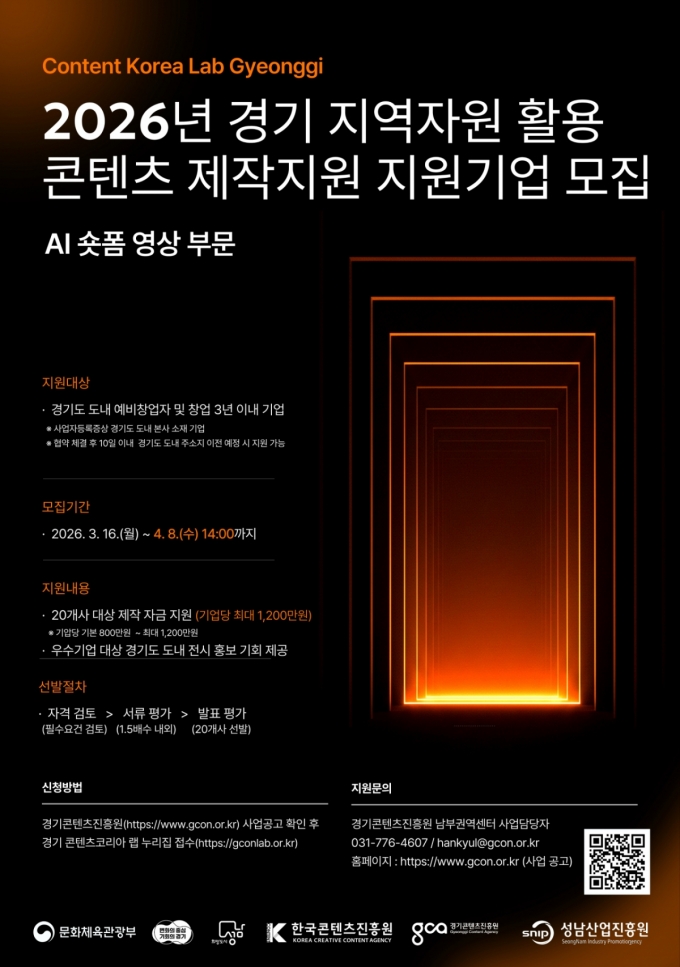 À̹ø »ç¾÷Àº ÆÇ±³ °æ±âÄÜÅÙÃ÷ÄÚ¸®¾Æ·¦¿¡¼ ÁøÇàµÇ¸ç, AI ¼ôÆû ¿µ»ó Á¦ÀÛÀÌ °¡´ÉÇÑ ¿¹ºñ â¾÷ÀÚ ¶Ç´Â â¾÷ 3³â À̳»ÀÇ °æ±âµµ ¼ÒÀç ±â¾÷À» ´ë»óÀ¸·Î ÇÑ´Ù. Çù¾à ü°á ÈÄ 10ÀÏ À̳» °æ±âµµ·Î ÀÌÀüÀÌ °¡´ÉÇÑ ±â¾÷µµ ½ÅûÇÒ ¼ö ÀÖ´Ù. 20°³ ±â¾÷À» ¼±¹ßÇÒ ¿¹Á¤ÀÌ´Ù.