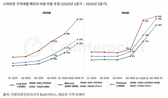 Ä«¿îÅÍÆ÷ÀÎÆ®¸®¼Ä¡´Â Áö³ 11ÀÏ º¸°í¼¿¡¼ ¿ÃÇØ 1ºÐ±â ±âÁØ µð·¥(DRAM) °¡°ÝÀº ÀüºÐ±â ´ëºñ 50% ÀÌ»ó, ³½µå Ç÷¡½Ã(NAND Flash) °¡°ÝÀº ÀüºÐ±â ´ëºñ 90% ÀÌ»ó »ó½ÂÇß´Ù°í ¹àÇû´Ù. ÀÌ °°Àº °¡°Ý »ó½Â¼¼°¡ Áö¼ÓµÇ¸é¼ ¿ÃÇØ 2ºÐ±â 800´Þ·¯ ÀÌ»óÀÇ ÇÁ¸®¹Ì¾ö ½º¸¶Æ®Æù¿¡¼ D·¥°ú ³½µå°¡ ¿ø°¡¿¡¼ Â÷ÁöÇÏ´Â ºñÁßÀÌ °¢°¢ 23%¿Í 18%¿¡ ´ÞÇÒ °ÍÀ̶ó´Â ºÐ¼®À» ³»³õ±âµµ Çß´Ù.