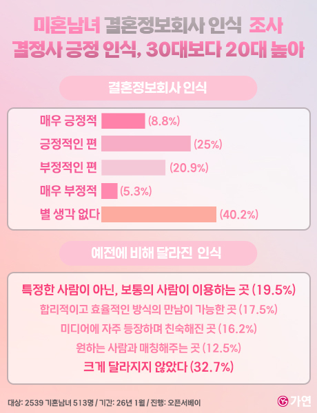 °¡¿¬°áÈ¥Á¤º¸¢ß(ÀÌÇÏ °¡¿¬)Àº Áö³ 1¿ù28ÀÏ ¿ÀǼº£À̸¦ ÅëÇØ ÁøÇàÇÑ '2026 ¿¬¾Ö¡¤°áÈ¥ ÀÎ½Ä Á¶»ç' °á°ú¸¦ 19ÀÏ ¹ßÇ¥Çß´Ù. À̹ø Á¶»ç´Â 25~39¼¼ ¹ÌÈ¥³²³à 500¸íÀ» ´ë»óÀ¸·Î ÁøÇàµÆÀ¸¸ç ½Å·Ú¼öÁØ 95%¿¡ Ç¥º»¿ÀÂ÷´Â ¡¾4.38%p´Ù.