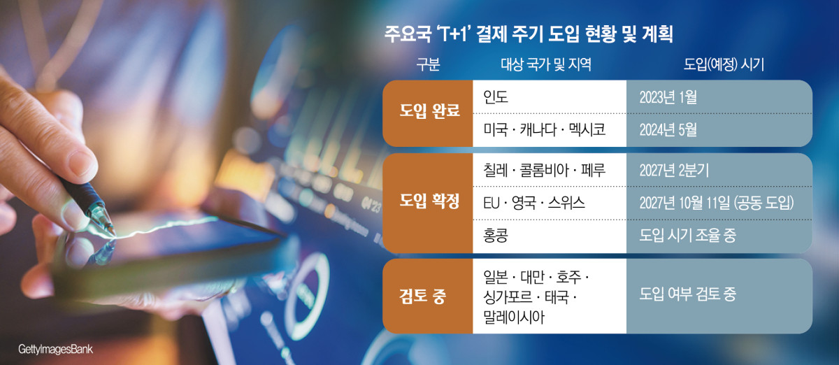 ¡®T+1¡¯ µµÀÔÀ» ¾ÕµÐ ±¹°¡µµ ¸¹´Ù. ¿µ±¹°ú À¯·´¿¬ÇÕ(EU), ½ºÀ§½º´Â 2027³â 10¿ù 11ÀÏ µ¿½Ã ÀüȯÀ» ¸ñÇ¥·Î ÇÕÀǸ¦ ¸¶ÃÆ´Ù. Ä¥·¹¡¤ÄÝ·Òºñ¾Æ¡¤Æä·ç µî Áß³²¹Ì ±¹°¡µéµµ 2027³â 2ºÐ±â µµÀÔÀ» ¾ÕµÎ°í ÀÖ´Ù. À̵éÀÇ °èȹÀÌ Â÷Áú ¾øÀÌ ÁøÇàµÇ¸é ½Ã°¡ÃÑ¾× ±âÁØ Àü ¼¼°è ½ÃÀåÀÇ ¾à 75%°¡ ¡®T+1¡¯·Î ÀüȯÀ» ¸¶Ä¡°Ô µÈ´Ù.