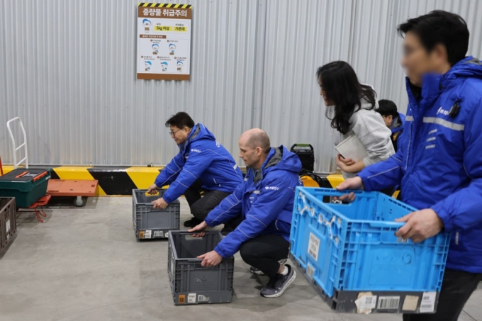°ø°³µÈ »çÁøÀ» º¸¸é ¿° ÀÇ¿ø°ú ·ÎÀú½º ´ëÇ¥´Â '·ÎÄÏ ¹è¼Û' '·ÎÄÏ ÇÁ·¹½Ã' µîÀÌ ÀûÈù ¹Ú½ºµéÀ» ¹è¼Û Â÷·®¿¡ ¿Å°Ü ½Ç¾ú´Ù. ¹«¸À» ²Ý°í Ç㸮¸¦ ¼÷ÀΠä Á÷Á¢ ¹«°Å¿î ¹Ú½ºµéÀ» À̰÷Àú°÷ ¿Å±â±âµµ Çß´Ù. ÅÃ¹è »óÀÚ¿¡ ºÙ¿©Áø ¹ÙÄÚµå ½ºÆ¼Ä¿µµ ²Ä²ÄÇÏ°Ô »ìÆñ´Ù. ¾ç¼Õ¿¡ ÅÃ¹è ¹°·®À» µé°í ¾ÆÆÄÆ® °è´ÜÀ» ¿À¸£¸ç Á÷Á¢ ¹è¼Û ¾÷¹«µµ ¼öÇàÇß´Ù.