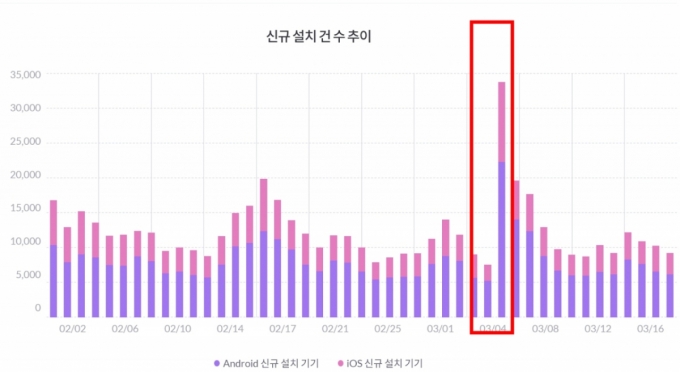 2¿ù ¸¶Áö¸·³¯ÀÎ 28ÀÏ ¾Èµå·ÎÀ̵å¿Í iOS¸¦ ÇÕÇØ ³ÝÇø¯½º ¾ÛÀ» ½Å±Ô ¼³Ä¡ÇÑ °Ç¼ö´Â 1¸¸1286°ÇÀ̾ú´Ù. ±×·¯³ª ÀÌÈÄ 3¿ù1ÀÏ 1¸¸4020°ÇÀ¸·Î ´Ã´õ´Ï 5ÀÏ¿¡´Â 3¸¸3745°Ç±îÁö È®´ëµÆ´Ù. 3¿ù5ÀÏ ¼öÄ¡´Â ¿ÃÇØ ³ÝÇø¯½º ¾Û Àϰ£ ½Å±Ô ¼³Ä¡°Ç¼ö Áß ÃÖ´ë¿´°í, 2¿ù¸»°ú ºñ±³Çϸé 3¹è Áõ°¡ÇÑ ¼öÁØÀÌ´Ù. ÀÌÈÄ¿¡µµ ½Å±Ô ¾Û ´Ù¿î·Îµå °Ç¼ö´Â 1¸¸°Ç ¼öÁØÀ» À¯ÁöÇϰí ÀÖ´Ù.