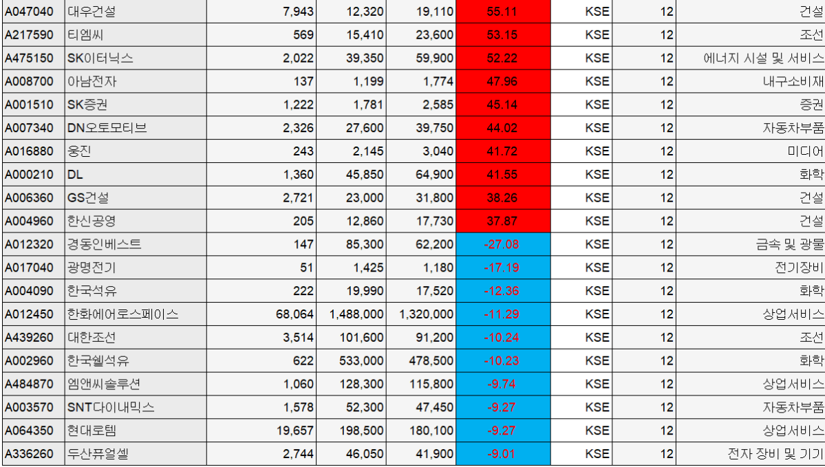 ÄÚ½ºÇÇ ½ÃÀå¿¡¼´Â ´ë¿ì°Ç¼³ÀÌ ÇÑ ÁÖ°£ 55.11% ¿À¸£¸ç »ó½Â·ü 1À§¸¦ ±â·ÏÇß´Ù. Ƽ¿¥¾¾(53.15%), SKÀÌÅʹнº(52.22%), ¾Æ³²ÀüÀÚ(47.96%), SKÁõ±Ç(45.14%)µµ ³ª¶õÈ÷ ±ÞµîÇß´Ù. DN¿ÀÅä¸ðƼºê(44.02%), ¿õÁø(41.72%), DL(41.55%), GS°Ç¼³(38.26%), ÇѽŰø¿µ(37.87%)µµ »ó½Â »óÀ§±Ç¿¡ À̸§À» ¿Ã·È´Ù. ½ÃÀå¿¡¼´Â °Ç¼³ÁÖ¿Í ¿¡³ÊÁö ¼³ºñ¡¤¼ºñ½º, Áõ±ÇÁÖ¸¦ Áß½ÉÀ¸·Î ¼ö±ÞÀÌ ¸ô¸®¸ç ¼øÈ¯¸Å°¡ °ÇÏ°Ô ³ªÅ¸³ °ÍÀ¸·Î º¸°í ÀÖ´Ù.
