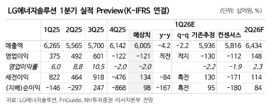 LG¿¡³ÊÁö¼Ö·ç¼ÇÀÇ 2026³â 1ºÐ±â ½ÇÀûÀº ¿¡³ÊÁö ÀúÀå ÀåÄ¡(ESS)ÀÇ »ý»ê·® È®´ëÀÎ ·¥ÇÁ¾÷(Ramp-up)¿¡µµ ºÒ±¸Çϰí, ÀÚµ¿Â÷ ºÎ¹®ÀÇ ºÎÁø ½ÉÈ·Î ÀûÀÚ°¡ Áö¼ÓµÉ Àü¸ÁÀÌ´Ù.