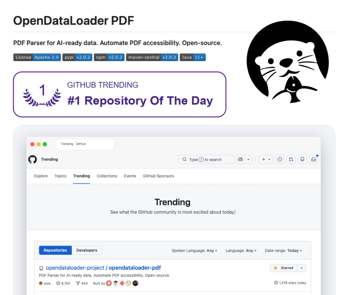 Çѱ۰úÄÄÇ»ÅÍÀÇ PDF µ¥ÀÌÅÍ ÃßÃâ ¿ÀǼҽº ÇÁ·ÎÁ§Æ® ¡®¿Àǵ¥ÀÌÅͷδõ(OpenDataLoader) PDF v2.0¡¯ÀÌ ¼¼°è ÃÖ´ë ¿ÀǼҽº °³¹ß Ç÷§Æû ±êÇãºê(GitHub)¿¡¼ 20ÀÏ Àüü °³¹ß ¾ð¾î ´ë»óÀ¸·Î Æ®·»µù 1À§¸¦ ´Þ¼ºÇÏ°í Æ®·»µù ¹èÁö¸¦ ȹµæÇß´Ù.
