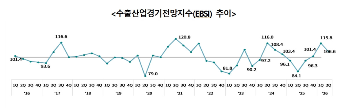 Çѱ¹¹«¿ªÇùȸ´Â ¡®2026³â 2ºÐ±â ¼öÃâ»ê¾÷°æ±âÀü¸ÁÁö¼ö(EBSI)¡¯°¡ 106.6À¸·Î Áý°èµÆ´Ù°í 23ÀÏ ¹àÇû´Ù. ÀÌ´Â ±âÁؼ±ÀÎ 100À» ¿ôµµ´Â ¼öÁØÀ¸·Î 3ºÐ±â ¿¬¼Ó È®Àå ±¹¸éÀ» À¯ÁöÇÑ °ÍÀÌ´Ù.