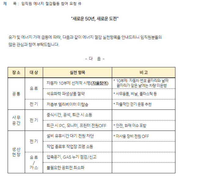24ÀÏ ¾÷°è¿¡ µû¸£¸é HDÇö´ë´Â ÀüÀÏ ¿¡³ÊÁö Àý°¨ ¹æ¾ÈÀ» ¼ö¸³ÇØ Àü ±×·ì»ç¿Í »ç¾÷Àå¿¡ °øÁöÇß´Ù. ¡®À¯°¡ ¹× ¿¡³ÊÁö °¡°Ý ±Þµî¿¡ µû¸¥ ÀÓÁ÷¿ø ¿¡³ÊÁö Àý°¨ ½Çõ Ç׸ñ¡¯À̶õ À̸§À¸·Î 5°³ Àý°¨ ¹æ¾ÈÀ» Á¦½ÃÇß´Ù.