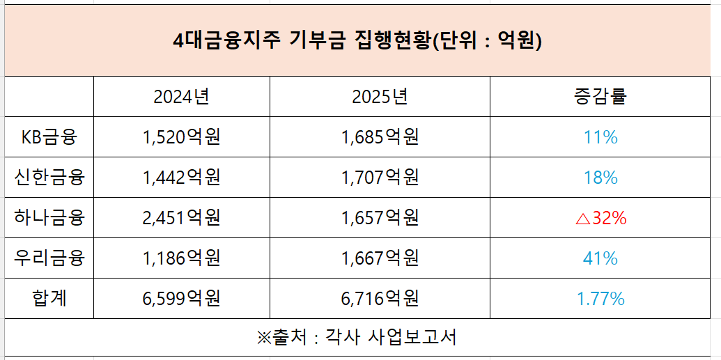 25ÀÏ ±ÝÀ¶±Ç¿¡ µû¸£¸é KB¡¤½ÅÇÑ¡¤Çϳª¡¤¿ì¸® µî 4´ë ±ÝÀ¶ÁöÁÖÀÇ 2025³â ±âºÎ±Ý ÃѾ×Àº 6716¾ï¿øÀ¸·Î Áý°èµÆ´Ù. ÀÌ´Â Àü³â(6599¾ï¿ø) ´ëºñ ¾à 117¾ï¿ø Áõ°¡ÇÑ ¼öÄ¡´Ù. ±ÝÀ¶ÁöÁÖº°·Î º¸¸é ½ÅÇѱÝÀ¶ÀÌ 1707¾ï¿øÀ¸·Î °¡Àå ¸¹¾Ò°í KB±ÝÀ¶ÀÌ 1685¾ï¿ø, ¿ì¸®±ÝÀ¶ÀÌ 1667¾ï¿ø, Çϳª±ÝÀ¶ÀÌ 1657¾ï¿øÀ¸·Î µÚ¸¦ À̾ú´Ù.