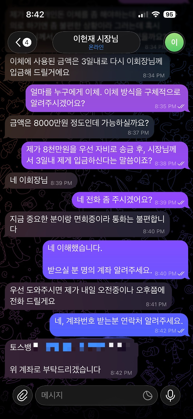 ÇØÄ¿´Â ½ÇÁ¦ ÀÔ±Ýó·Î 'Å佺¹ðÅ© 1002-2568-5728 ½Å°íÀº'À̶ó´Â ƯÁ¤ °èÁ¸¦ Á¦½ÃÇÏ¸ç ¹üÇàÀ» ½ÃµµÇß´Ù. ¶Ç ¸Þ½ÃÁö¸¦ ¹ÞÀº ½Ã¹ÎÀÌ º»ÀÎ È®ÀÎÀ» À§ÇØ ÀüÈ Åëȸ¦ ¿äûÇÏÀÚ "Áß¿äÇÑ ºÐ°ú ¸éȸ ÁßÀ̶ó ÅëȰ¡ ¾î·Æ´Ù"°í ´äÇϸç Åëȸ¦ ÇÇÇß´Ù.