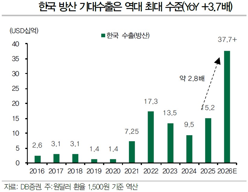 ¼ÀçÈ£ DB±ÝÀ¶Áõ±Ç ¿¬±¸¿øÀº ¡°ÀØÁö ¸»¾Æ¾ß ÇÒ °ßÁ¶ÇÑ ¼öÃâ ÆÄÀÌÇÁ¶óÀÎÀ¸·Î ÀÎÇØ ¿ª´ë ÃÖ°íÄ¡ °æ½ÅÀÌ ±â´ëµÈ´Ù¡±¸ç ¡°2026³â ±â´ë ¼öÃâ ¼öÁÖ´Â 2025³â ´ëºñ 3.7¹è ¼öÁØÀ¸·Î ¹æ»ê ¼öÃâÀÇ ÄöÅÒÁ¡ÇÁ°¡ ±â´ëµÇ´Â ÇØ¡±¶ó°í ºÐ¼®Çß´Ù. ±â¾÷º° ±â´ë ¼öÁÖ ±Ô¸ð´Â ÇÑÈ¿¡¾î·Î½ºÆäÀ̽º 23Á¶3000¾ï¿ø, Çö´ë·ÎÅÛ 23Á¶2000¾ï¿ø, Çѱ¹Ç×°ø¿ìÁÖ(KAI) 6Á¶5000¾ï¿ø, LIG³Ø½º¿ø 3Á¶6000¾ï¿ø ¼öÁØÀ¸·Î Áý°èµÆ´Ù.