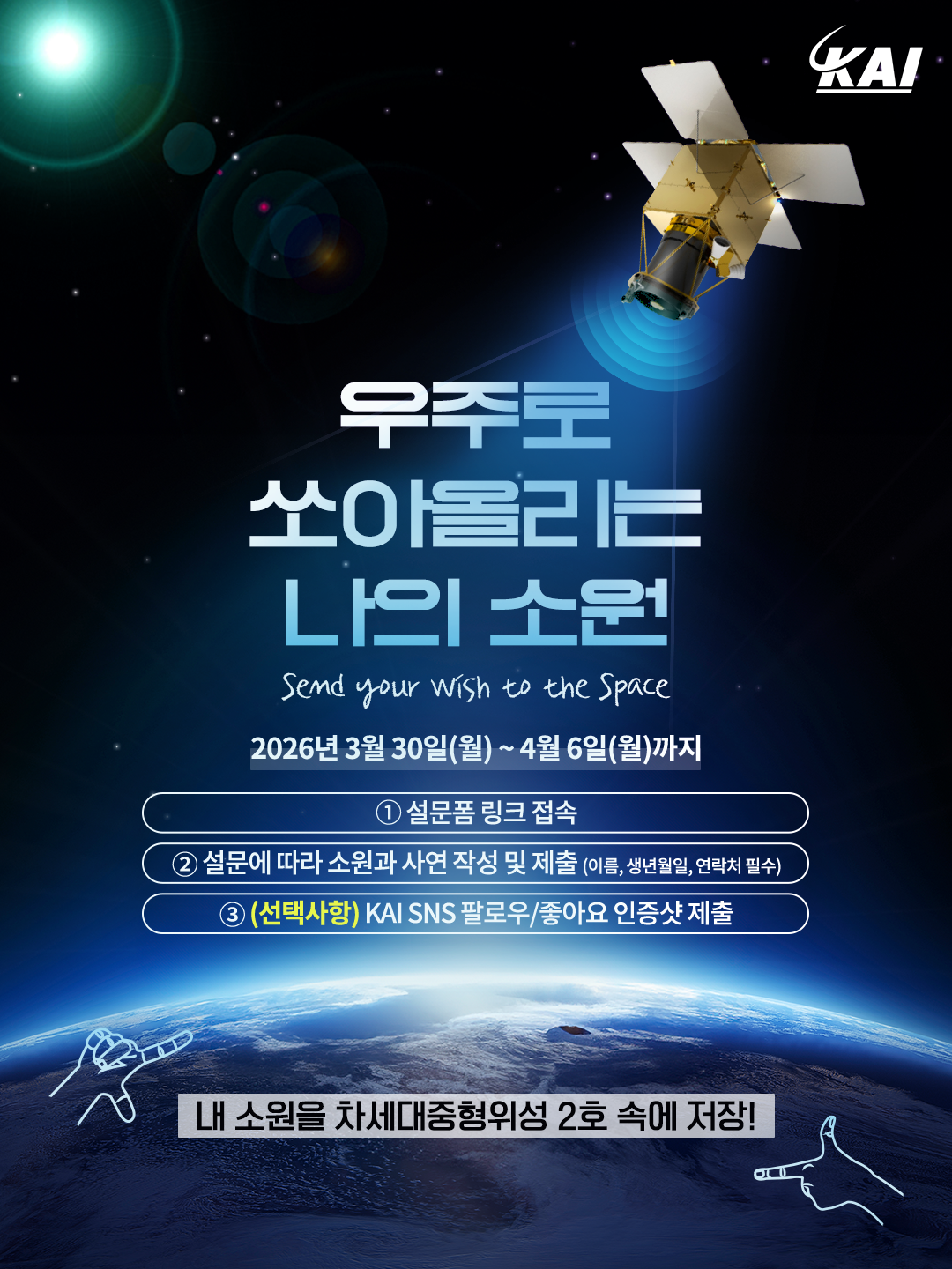 ÀÀ¸ð´Â ³»´Þ 6ÀϱîÁö ¹ÞÀ¸¸ç, ´ëÇѹα¹ ±¹¹ÎÀ̶ó¸é ´©±¸³ª Âü¿©ÇÒ ¼ö ÀÖ´Ù. KAI´Â Á¢¼öµÈ ¸Þ½ÃÁö¿Í »ç¿¬ Áß ¹Ì·¡ ¼¼´ëÀÇ ²Þ, û³âÃþÀÇ µµÀü ÀÇÁö, K-À§¼º ¹ß»ç ÀÀ¿ø µî ÁøÁ¤¼º ÀÖ´Â ¸Þ½ÃÁö¸¦ ¿ì¼±ÀûÀ¸·Î °í·ÁÇØ ÃÑ 50¸íÀ» ¼±Á¤, ´ÙÀ½ ´Þ 9ÀÏ¿¡ ¹ßÇ¥ÇÒ ¿¹Á¤ÀÌ´Ù.
