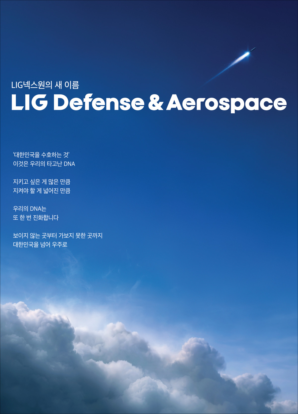 LIG³Ø½º¿øÀº ⸳ 50ÁÖ³âÀ» ¸Â¾Æ ¡®LIG µðÆæ½º&¿¡¾î·Î½ºÆäÀ̽º(LIG Defense&Aerospace¤ýLIG D&A)¡¯·Î »ç¸íÀ» º¯°æÇϰí, Ç×°ø¡¤¿ìÁÖ ºÐ¾ß¸¦ ¾Æ¿ì¸£´Â ¡®±Û·Î¹ú Á¾ÇÕ¹æ»ê±â¾÷¡¯À¸·ÎÀÇ µµ¾àÀ» ¼±¾ðÇß´Ù°í 31ÀÏ ¹àÇû´Ù.