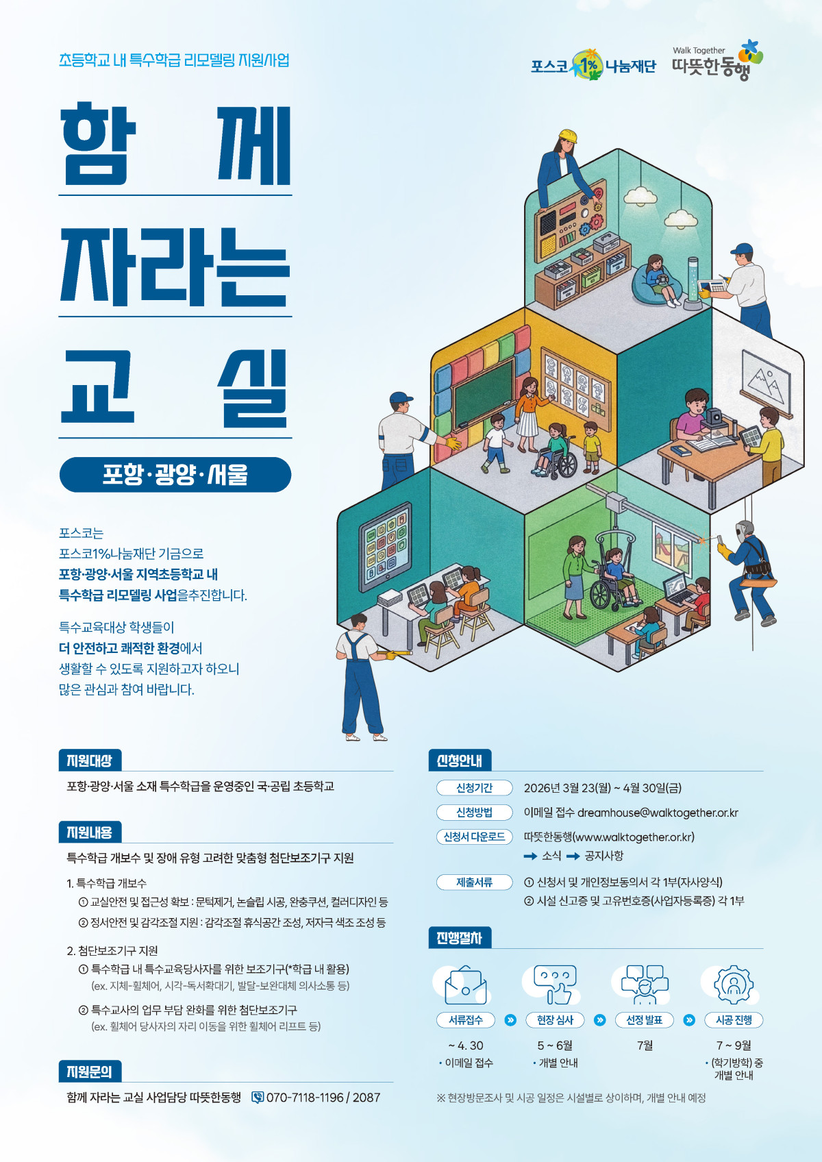 À̹ø »ç¾÷Àº Æ÷½ºÄÚ »ç¾÷Àå ¼ÒÀçÁöÀÎ Æ÷Çס¤±¤¾ç¡¤¼¿ï ±¹°ø¸³ ÃʵîÇб³ Ư¼öÇбÞÀ» ´ë»óÀ¸·Î Çϸç, Ư¼ö±³À°´ë»ó ÇлýµéÀÌ º¸´Ù ¾ÈÀüÇϰí ÄèÀûÇÑ È¯°æ¿¡¼ ÇнÀÇÒ ¼ö ÀÖµµ·Ï ¹°¸®Àû ȯ°æ Á¶¼ººÎÅÍ ¸ÂÃãÇü ÇнÀ º¸Á¶±â±¸ Áö¿ø±îÁö Æ÷°ýÀûÀÎ Áö¿øÀ» Á¦°øÇÑ´Ù.