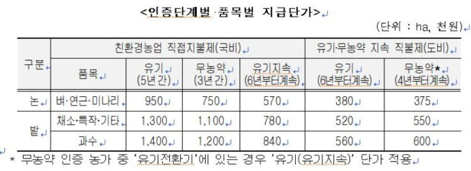 Áö¿ø¸éÀûÀº ³ó°¡´ç 0.1ºÎÅÍ 30ha±îÁö´Ù. ¹«³ó¾àÀº 3³â(3ȸ), À¯±â´Â 5³â(5ȸ) ÀÎÁõ´Ü°èº°¡¤Ç°¸ñº° Áö±Þ´Ü°¡´Â ha´ç À¯±â³óÀº 95¸¸~140¸¸¿ø, ¹«³ó¾àÀº 75¸¸~120¸¸¿øÀÌ´Ù. ¶ÇÇÑ Àú³ó¾à Áö±Þ ÀÌ·ÂÀº Á¦¿ÜÇØ ģȯ°æ ÀÎÁõ ³ó°¡ÀÇ Á÷ºÒ±Ý ¼öÇý ±âȸ¸¦ È®´ëÇß´Ù.