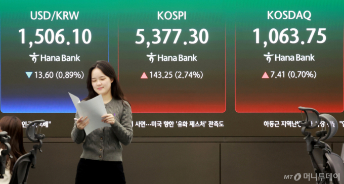 3ÀÏ ÄÚ½ºÇÇ´Â Àü °Å·¡ÀÏ ´ëºñ 143.25Æ÷ÀÎÆ®(2.74%) ¿À¸¥ 5377.30¿¡ °Å·¡¸¦ ¸¶ÃÆ´Ù. À̳¯ 141.45Æ÷ÀÎÆ®(2.70%) ¿À¸¥ 5375.50À¸·Î °Å·¡¸¦ ½ÃÀÛÇÑ ÄÚ½ºÇÇ´Â ²ÙÁØÈ÷ 2%´ë ÀÌ»ó °¼¼¸¦ À¯ÁöÇß´Ù. Àå Áß ÇÑ ¶§´Â 5419.45±îÁö ȸº¹Çϱ⵵ Çß´Ù.