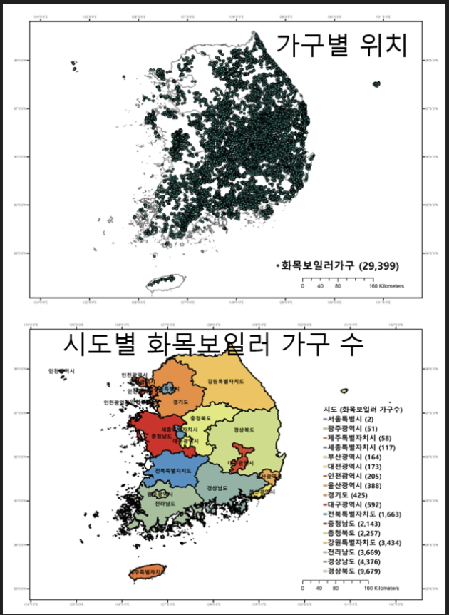 À̹ø ºÐ¼®Àº »ê¸²Ã»ÀÌ Á¦°øÇÑ Àü±¹ »ê¸² ÀÎÁ¢ Áö¿ª(»ê¸²À¸·ÎºÎÅÍ 100m À̳»)¿¡ À§Ä¡ÇÑ È¸ñº¸ÀÏ·¯ »ç¿ë°¡±¸ 2¸¸9399°³ ÁöÁ¡ÀÇ À§Ä¡ Á¤º¸¸¦ Ȱ¿ëÇØ ¼öÇàµÆ´Ù. 5§° ¹Ý°æ ±âÁØ ´ÜÀ§ ¸éÀû´ç ȸñº¸ÀÏ·¯ »ç¿ë°¡±¸ÀÇ ¹ÐÁýµµ¸¦ »êÃâÇÑ °á°ú °æºÏ¡¤°æ³²¡¤Àü³²¡¤ÃæºÏ¡¤Ãæ³²¡¤°¿ø µî »ê°£ Áö¿ª¿¡ ÁýÁß ºÐÆ÷ÇÏ´Â °æÇâÀ» º¸¿´´Ù.