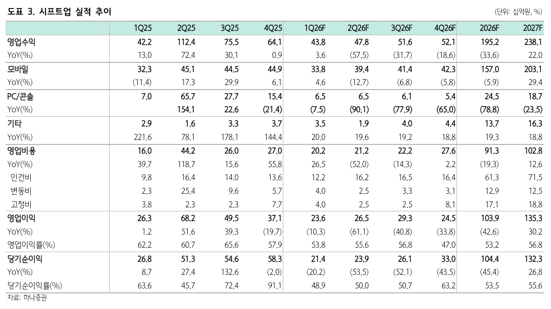 º¸°í¼¿¡ µû¸£¸é ½ÃÇÁÆ®¾÷Àº 1ºÐ±â ¿µ¾÷¼öÀÍ 438¾ï¿ø, ¿µ¾÷ÀÌÀÍ 236¾ï¿øÀ» ±â·ÏÇÏ¸ç ½ÃÀå ±â´ëÄ¡¸¦ ÇÏȸÇÒ °ÍÀ¸·Î Àü¸ÁµÈ´Ù. ´ëÇ¥ÀÛ ¡®½Â¸®ÀÇ ¿©½Å: ´ÏÄÉ¡¯´Â À̺¥Æ®¿Í Çù¾÷ È¿°ú·Î Æ®·¡ÇÈÀº °ßÁ¶ÇßÀ¸³ª ¸ÅÃâÀº ÀüºÐ±â ´ëºñ °¨¼ÒÇÑ °ÍÀ¸·Î ÆÄ¾ÇµÈ´Ù. ÄÜ¼Ö ±â¹Ý ¡®½ºÅÚ¶ó ºí·¹À̵塯 ¿ª½Ã ÇÒÀÎ ÆÇ¸Å¸¦ ÅëÇØ ÀÏÁ¤ ¼öÁØÀÇ ÆÇ¸Å·®À» À¯ÁöÇßÁö¸¸ Àü¹ÝÀûÀÎ ¸ÅÃ⠱⿩µµ´Â Ãà¼ÒµÈ °ÍÀ¸·Î ÃßÁ¤µÈ´Ù.