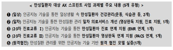º¹ÁöºÎ´Â ±× Áß ¸¸¼ºÁúȯ ´ë»ó AX ½ºÇÁ¸°Æ® »ç¾÷À» ÃßÁøÇÑ´Ù. ±¸Ã¼Àû °úÁ¦´Â ¡âÀΰøÁö´É ±â¼úÀ» ÅëÇÑ ÀÏ»ó»ýȰ ¼Ó ¸¸¼ºÁúȯÀÚ °Ç°°ü¸®(¿îµ¿, ½Ä½À°ü µî, 2°³) ¡âÀΰøÁö´É ±â¼úÀ» ÅëÇÑ ¸¸¼ºÁúȯ °ü¸® ÀÏÂ÷ ÀǷἺñ½º °³¼± (¿µ»óÆÇµ¶ Áö¿ø, Áø·á Áö¿ø, 1°³) ¡âÀΰøÁö´É ±â¼úÀ» ÅëÇÑ ¸¸¼ºÁúȯÀÚ Áø·á ¿¬°è Áö¿ø (EMR ¿¬°è, 1°³) ¡âÀΰøÁö´É ±â¼úÀ» ÅëÇÑ ¸¸¼ºÁúȯÀÚ ¿µ»óÆÇµ¶ ¿¬°è Áö¿ø (PACS ¿¬°è, 1°³) ¡â¸¸¼ºÁúȯ °ü¸®¸¦ À§ÇÑ ÀΰøÁö´É ±â¼ú ±â¹Ý ¿ø°Ý ÇùÁø ¸ðµ¨ ½ÇÁõ(1°³)ÀÌ´Ù.