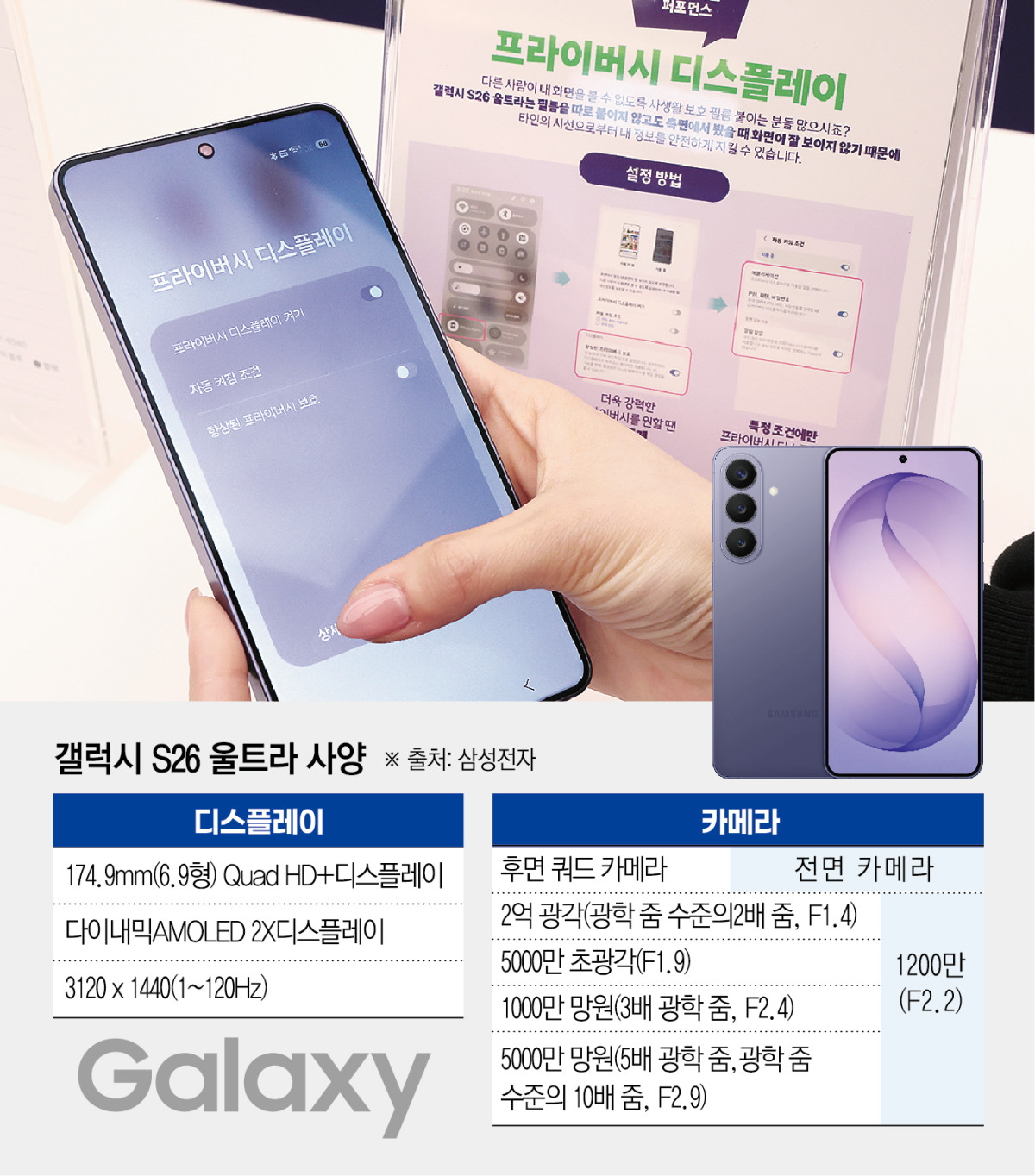 °¶·°½Ã S26 ¿ïÆ®¶ó¿¡´Â ½º¸¶Æ®Æù ÃÖÃÊ·Î ¡®ÇÁ¶óÀ̹ö½Ã µð½ºÇ÷¹ÀÌ¡¯°¡ Àû¿ëµÆ´Ù. Ãø¸é ½Ã¾ß¿¡¼ ȸéÀÌ º¸ÀÌÁö ¾Êµµ·Ï Á¦ÇÑÇÏ´Â ±â´ÉÀÌ´Ù. ÁöÇÏöÀ̳ª Ä«Æäó·³ »ç¶÷ÀÌ ¸¹Àº °ø°£¿¡¼ ü°¨µµ°¡ ³ô¾Ò´Ù. ¸Þ½ÅÀú³ª ±ÝÀ¶ ¾Û »ç¿ë ½Ã ƯÈ÷ À¯¿ëÇß´Ù.